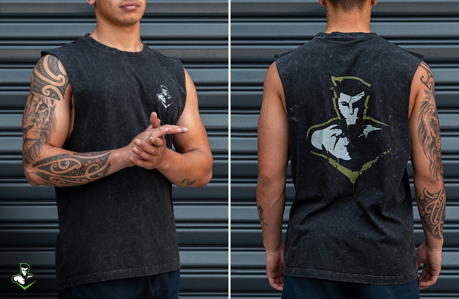 Premium cotton Mr Supplement distressed logo muscle tee in acid wash. Perfect for training or casual wear.